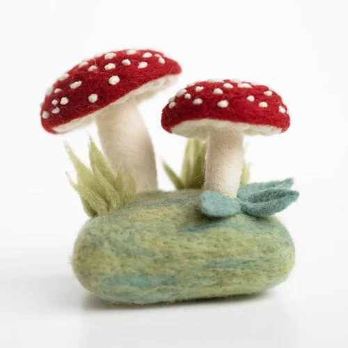 This needle felting kit includes everything needed to make one cute mushroom sculpture complete with grass and leaves. Perfect for a windowsill, little shelf, or work space.
