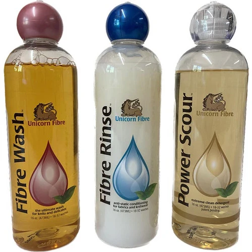 A complete set of the classic Unicorn line. Permits easy washing (scouring) and conditioning of raw fleece, fiber and yarns. Spinners, weavers and knitters who create one-of-a-kind items will enjoy the benefits of these unique products. Biodegradable, Earth Friendly.
